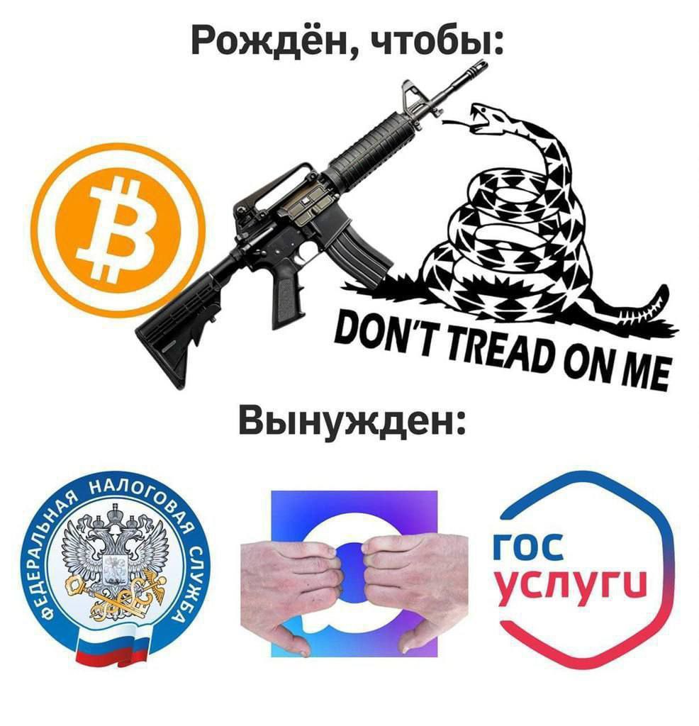 Мем разделён на две части: "Рождён, чтобы:" и "Вынужден:". В верхней части изображены символы свободы и независимости: логотип биткойна, штурмовая винтовка AR-15 и флаг Гадсдена со змеёй и надписью "Don't tread on me" (Не наступай на меня). Эти символы отражают идеи либертарианства, финансовой автономии и права на самозащиту. Нижняя часть "Вынужден:" показывает символы государственных институтов и контроля: логотип Федеральной налоговой службы, биометрическую идентификацию по отпечаткам пальцев, которая ассоциируется с банковскими приложениями, и логотип Госуслуг. Мем противопоставляет желаемый образ жизни, основанный на свободе и индивидуализме, с реальностью, где человек вынужден подчиняться государственному регулированию и контролю, в том числе и в финансовой сфере. Он отражает сарказм над ситуацией, когда личные свободы ограничиваются государственными органами.