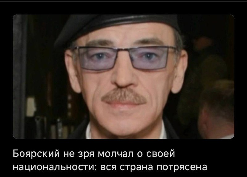 На изображении представлен коллаж, в котором лицо Михаила Боярского было отредактировано, чтобы оно напоминало Иосифа Сталина. У Боярского усы, как у Сталина, и надеты очки. Черный берет, который обычно носит Боярский, также присутствует на голове. Надпись под изображением гласит: "Боярский не зря молчал о своей национальности: вся страна потрясена", что является юмористическим намеком на возможную связь с грузинской национальностью Сталина. Коллаж создает комический эффект за счет неожиданного сходства двух известных личностей.