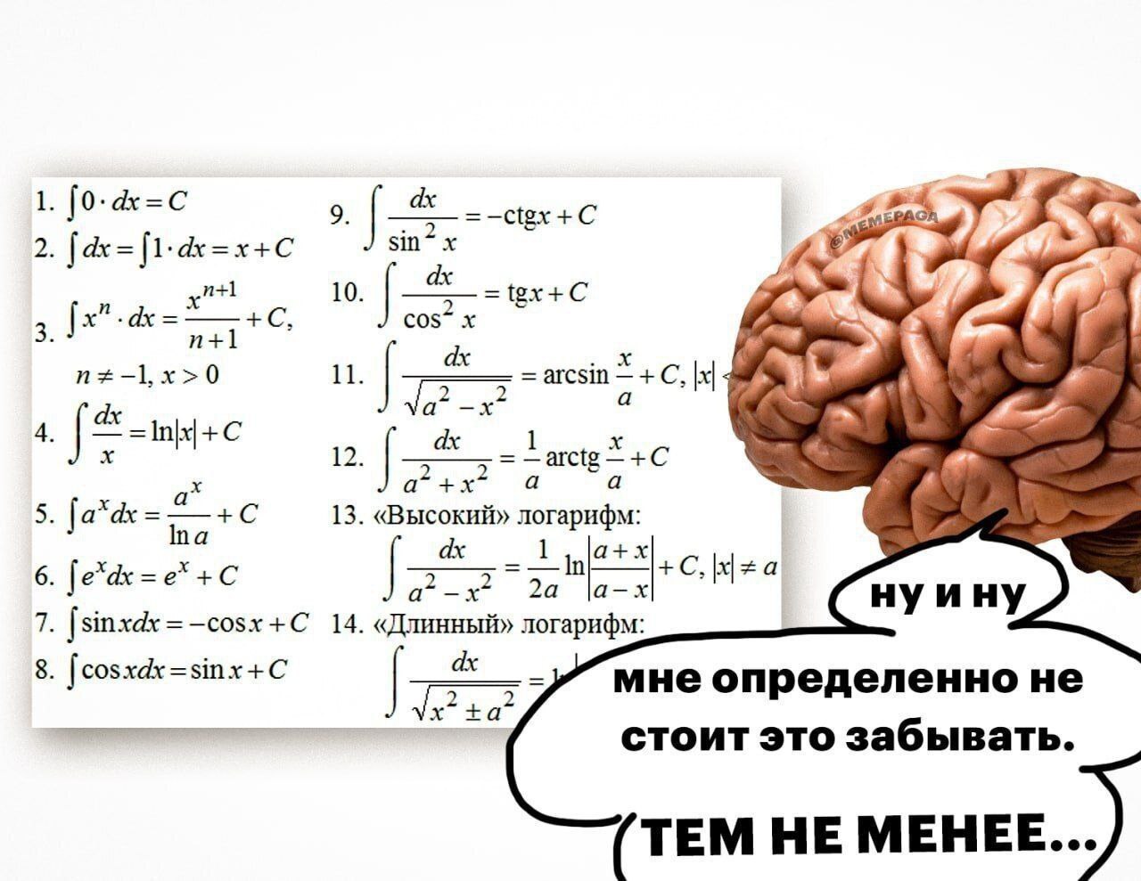 На изображении показан человеческий мозг, приставленный к листку бумаги с формулами по высшей математике, а именно — интегралами. Мозг "говорит" в "облачке" справа, что "НУ И НУ, МНЕ ОПРЕДЕЛЕННО НЕ СТОИТ ЭТО ЗАБЫВАТЬ. ТЕМ НЕ МЕНЕЕ...". Это выражение означает, что, несмотря на очевидную важность запоминания этих формул, мозг осознает свою склонность их забывать. При этом он как бы намекает на то, что это очень сложная тема. Мем символизирует трудности в обучении и запоминании сложной информации, особенно в точных науках, таких как математика.