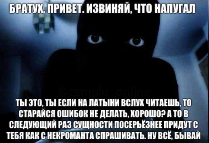 На картинке изображен темный силуэт человека или существа с двумя широко открытыми глазами, которые светятся в темноте. Остальная часть фигуры полностью черная, что создает жуткое и таинственное впечатление. На фоне видны размытые очертания комнаты или помещения с синеватым оттенком. Поверх изображения наложен текст на русском языке, который начинается со слов "Братух, привет. Извиняй, что напугал". Дальше текст объясняет, что если человек читает вслух на латыни, ему лучше не делать ошибок, иначе в следующий раз придут более серьезные сущности, чтобы спрашивать с него "как с некроманта". В конце "существо" прощается: "Ну всё, бывай".