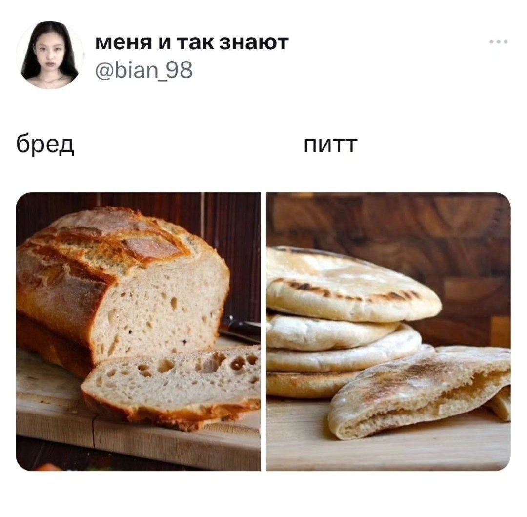 На изображении показан скриншот из социальной сети с текстом сверху и двумя фотографиями внизу. Слева изображён крупный батон деревенского хлеба с хрустящей корочкой, который частично нарезан на деревянной доске. Справа находится стопка лепёшек пита, одна из которых разрезана пополам, демонстрируя её полый карман. Над этими изображениями расположены надписи: слева слово «бред», а справа — «питт», что создает игру слов со словами «bread» (хлеб) и «pita» (пита).