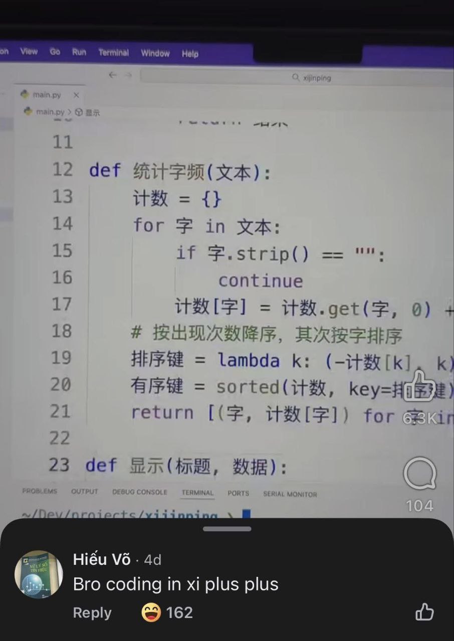 На изображении показан экран компьютера с открытой средой разработки (IDE), где отображается код на языке Python. В верхней части экрана виден заголовок "xijinping" в строке поиска, что указывает на название проекта или файла. Основная часть экрана занята кодом, который включает определения функций на китайском языке, например, "def 统计字频(文本):" (определение функции для подсчета частоты символов в тексте). Под кодом виден комментарий пользователя Hiếu Võ со словами "Bro coding in xi plus plus" и книгой на аватарке, что создает юмористический контраст с тем, что код написан на Python, а не на C++.