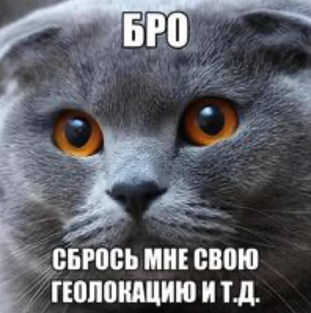 На изображении крупным планом показана голова британского кота с большими оранжевыми глазами и серой шерстью. Над ним и под ним расположены две надписи белого цвета. Верхняя надпись гласит "БРО", а нижняя "СБРОСЬ МНЕ СВОЮ ГЕОЛОКАЦИЮ И Т.Д.". Кот выглядит очень серьезным, и кажется, что он прямо смотрит на зрителя, требуя выполнения указанных в тексте действий. Создается впечатление, что кот говорит своему "бро" (другу) прислать ему геолокацию и другую информацию.