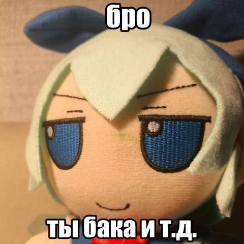 На изображении крупным планом показана мягкая игрушка аниме-персонажа с бирюзовыми волосами и большими синими глазами. Игрушка имеет слегка ухмыляющееся выражение лица, которое кажется надменным или озорным. Текст на меме на русском языке гласит: "Бро, ты бака и т.д.", что переводится как "Бро, ты дурак и т.д.".