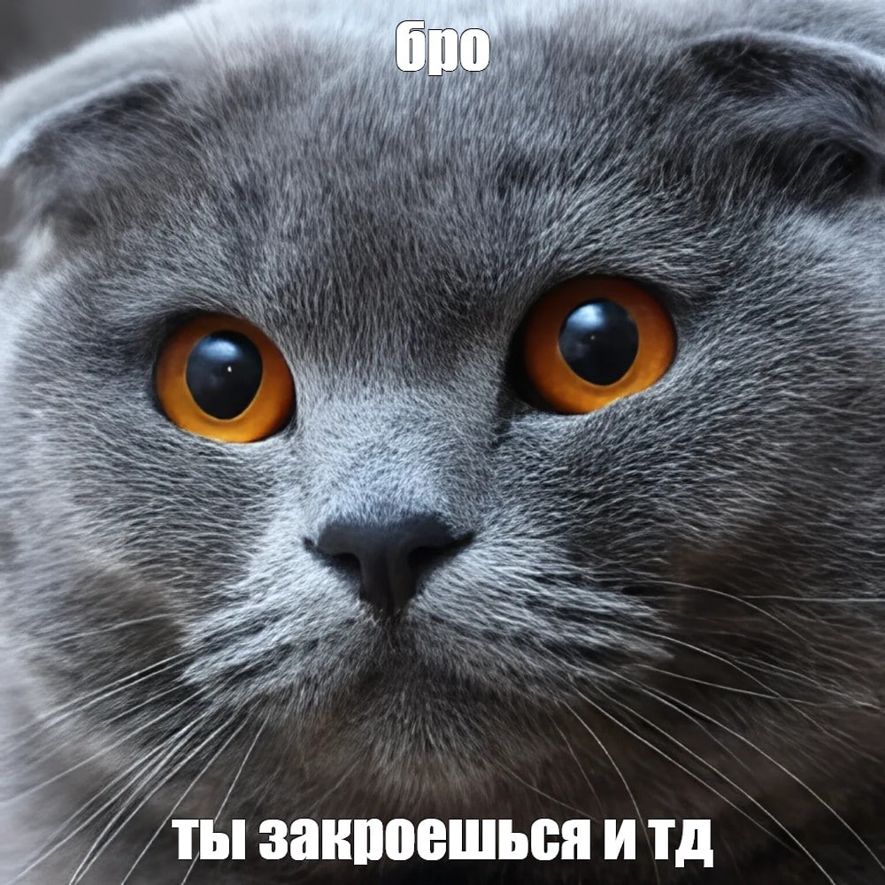На изображении крупным планом показана мордочка серого вислоухого кота с ярко-оранжевыми глазами, который смотрит прямо в камеру. Его взгляд кажется удивленным или даже слегка недовольным. Над ним, в верхней части изображения, написано слово «Бро», а в нижней — фраза «ты закроешься и тд», что по-русски означает «ты заткнешься и так далее».