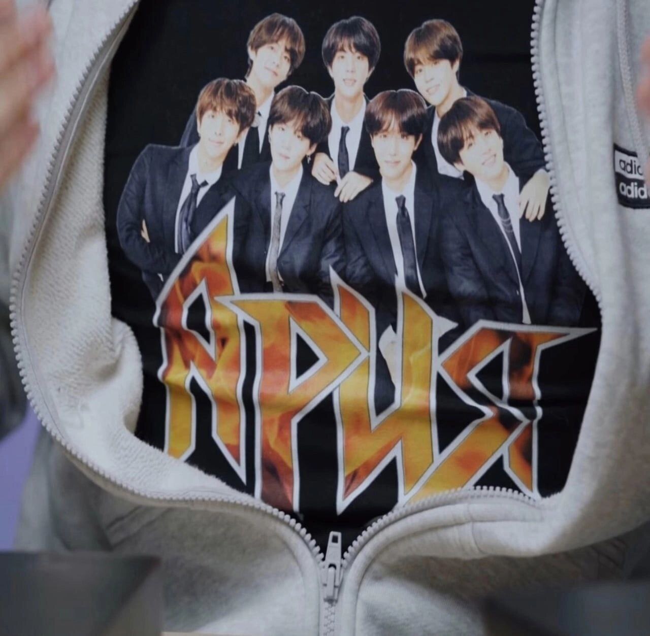 На изображении показан человек в расстегнутой светло-серой толстовке на молнии, под которой видна черная футболка. На футболке изображена популярная корейская поп-группа BTS, все участники которой одеты в черные костюмы с галстуками. Ниже на футболке расположена надпись, стилизованная под логотип известной рок-группы, которая гласит "АРИЯ". Это создает забавный контраст между милым образом корейских айдолов и брутальной эстетикой русского рока, подчеркивая неожиданное сочетание двух разных музыкальных культур. Мем обыгрывает идею несоответствия, где на футболке с изображением BTS используется логотип российской рок-группы, что вызывает улыбку у тех, кто знаком с обеими группами. Таким образом, футболка с АРИЕЙ и BTS одновременно может восприниматься как ироничный или шутливый способ выразить привязанность к совершенно разным музыкальным жанрам.