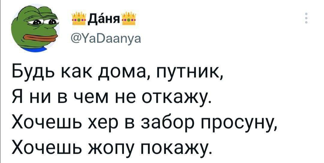 Мем представляет собой скриншот из социальной сети, предположительно из Твиттера, с изображением Пепе Лягушонка в профиле пользователя "Даня" (@YaDaanya). На белом фоне крупным черным шрифтом написано стихотворение из четырех строк, которое начинается с призыва "Будь как дома, путник, Я ни в чем не откажу" и заканчивается нецензурными предложениями: "Хочешь хер в забор просуну, Хочешь жопу покажу". Мем высмеивает чрезмерное или вульгарное гостеприимство, а также неожиданный и шокирующий поворот в общении. Он используется для обозначения ситуаций, когда кто-то предлагает помощь или гостеприимство, но делает это в крайне эксцентричной или неприемлемой манере, превращая приглашение в угрозу или абсурдную ситуацию.