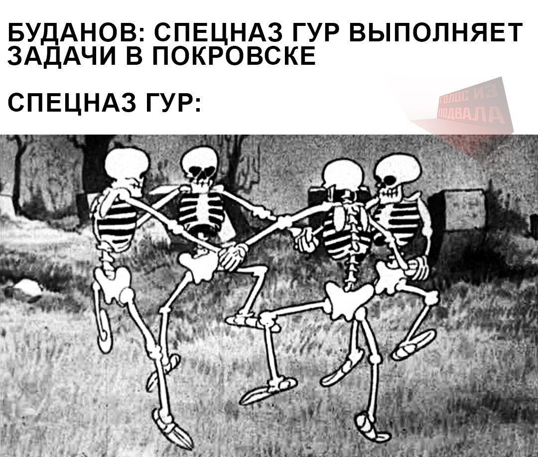 На меме изображена черно-белая анимация, где четверо скелетов танцуют, взявшись за руки, на фоне, напоминающем кладбище или заброшенную местность. Над изображением текст, разделенный на две части. Верхняя часть гласит: "Буданов: спецназ ГУР выполняет задачи в Покровске", а нижняя: "Спецназ ГУР:", после чего следует изображение танцующих скелетов. Мем высмеивает заявления Буданова о присутствии спецназа ГУР в Покровске, намекая, что, возможно, там остались только "скелеты" или что деятельность спецназа ГУР там выглядит "мертвой" или бессмысленной. Возможно, юмор заключается в ироничном сопоставлении серьезного заявления и абсурдного изображения, подчеркивающего бесполезность или нереальность сказанного. В правом верхнем углу виднеется надпись "ГОЛОС ИЗ ПОДВАЛА", наложенная на изображение. Скелеты, "танцующие" или просто двигающиеся в такт, создают комический эффект.
