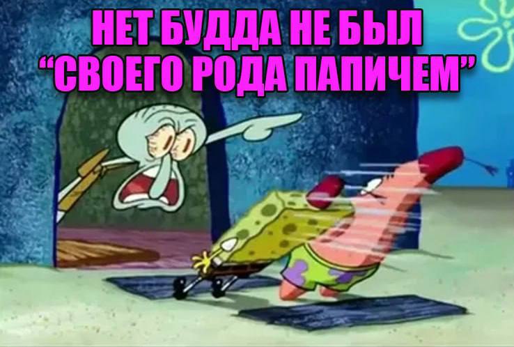 На меме изображены Сквидвард, Спанч Боб и Патрик из мультсериала "Губка Боб Квадратные Штаны". Сквидвард стоит слева, высунувшись из дверного проема, и кричит, указывая пальцем. В это время Патрик, расположенный справа, быстро тащит Спанч Боба, который лежит на небольшой тележке с колесиками. Спанч Боб пытается затормозить ногами, оставляя следы на песке. Надпись розового цвета сверху гласит: "Нет, Будда не был "своего рода папичем"". Этот мем используется для выражения несогласия или опровержения чьего-либо утверждения, часто касающегося неожиданных или абсурдных сравнений. Фраза "Будда не был своего рода папичем" (Будда не был своим видом Папича) высмеивает попытки связать несвязанные понятия или личности, подобно тому, как Патрик тащит Спанч Боба, несмотря на его сопротивление, игнорируя очевидное несоответствие.