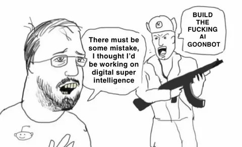На изображении представлен мем, состоящий из двух персонажей. Слева изображен грустный бородатый мужчина в очках с символом Reddit на футболке, который выглядит подавленным. Он говорит: "There must be some mistake, I thought I'd be working on digital super intelligence", что переводится как "Должно быть, это какая-то ошибка, я думал, что буду работать над цифровым суперинтеллектом". Справа стоит злой солдат в форме советского образца с автоматом в руках, который кричит: "BUILD THE FUCKING AI GOONBOT", что переводится как "СТРОЙ ЁБАННОГО ИИ-ГОНЬБОТА". Мем, вероятно, высмеивает ожидания от работы в сфере ИИ и реальность, где вместо создания прорывных технологий приходится заниматься более приземленными задачами. Он также может быть отсылкой к стереотипам о России и СССР, где "гон-боты" ассоциируются с пропагандой или подавлением инакомыслия.