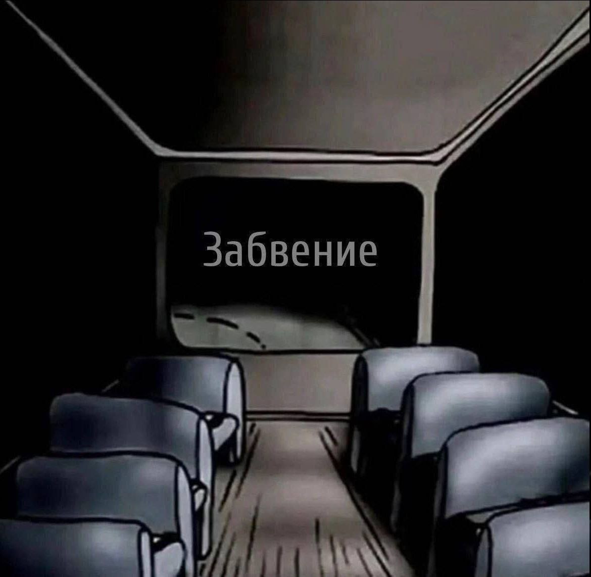 На изображении показан пустой салон автобуса, снятый с места позади водителя. Видно несколько рядов серых сидений, расположенных по обе стороны от прохода. Впереди через лобовое стекло видна темная, неопределенная дорога, символизирующая забвение. На стекле написано слово «Забвение» на русском языке, что означает «Oblivion» в переводе. Это создает атмосферу таинственности и некоторой меланхолии, намекая на путешествие в неизвестность или конец чего-либо. Мем часто используется для иллюстрации ситуаций, когда что-то или кто-то отправляется в небытие, забывается или исчезает без следа. Он может быть применен к забытым вещам, уходящим трендам, или просто к чувству потери и безысходности.