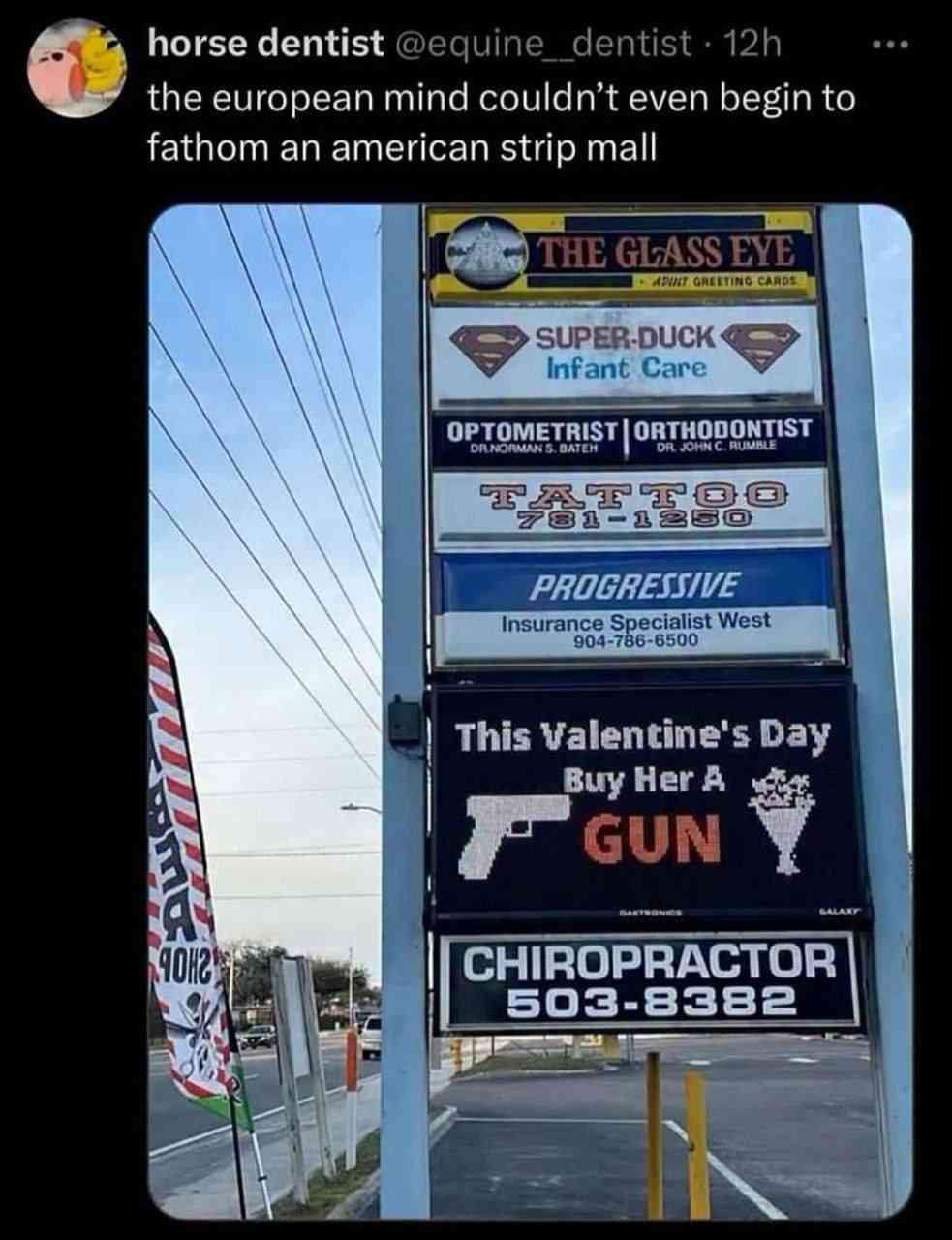 На изображении представлен скриншот из Твиттера с подписью пользователя @equine_dentist, который пишет: "европейский разум даже не смог бы постичь американский стрип-молл". Ниже показана фотография указателя американского торгового центра, на котором расположены вывески различных заведений. Среди них можно увидеть "The Glass Eye" (возможно, магазин для взрослых открыток), "Super-Duck Infant Care" (уход за младенцами), "Optometrist Orthodontist" (оптометрист/ортодонт), "Tattoo" (тату-салон), "Progressive Insurance Specialist West" (страховая компания) и "Chiropractor" (хиропрактик). Особенно выделяется электронная вывеска между страховой компанией и хиропрактиком, на которой крупным шрифтом написано: "This Valentine's Day Buy Her A GUN" (В этот День святого Валентина купи ей пистолет). Рядом с надписью изображен пиксельный пистолет и пиксельный букет цветов, что подчеркивает необычное и, возможно, юмористическое, а для европейцев - удивительное предложение подарка. Все это подчеркивает контраст американской культуры с европейской, как указано в твите.