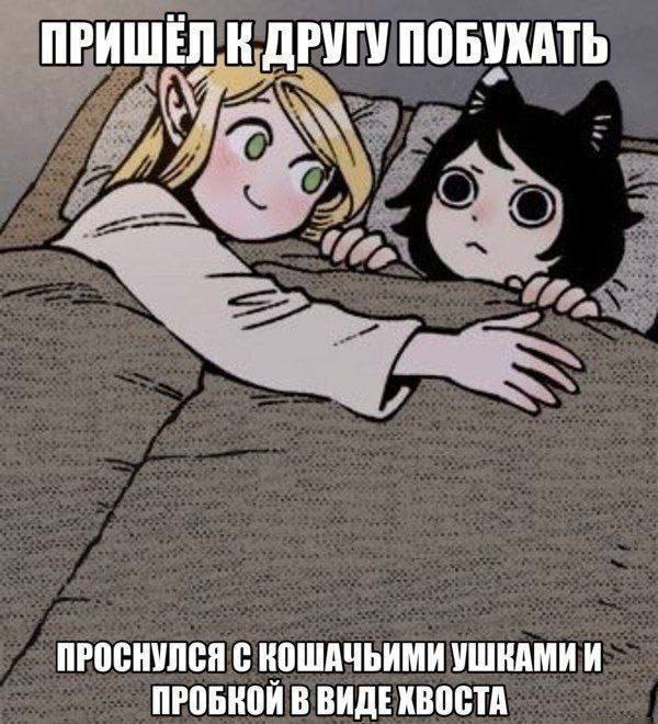 На изображении показаны две девушки в постели. Одна из них — светловолосая эльфийка с румянцем на щеках и улыбкой, лежащая на боку и протягивающая руку вперёд. Рядом с ней, под одеялом, находится другая девушка с черными волосами и кошачьими ушками, ее глаза широко раскрыты, и она выглядит удивленной или озадаченной. Надпись сверху гласит: «Пришёл к другу побухать», а снизу: «Проснулся с кошачьими ушками и пробкой в виде хвоста». Это намекает на забавную и неожиданную трансформацию после бурной вечеринки, когда героиня просыпается с кошачьими атрибутами и анальной пробкой, имитирующей хвост. Таким образом, изображение передает комическую ситуацию, связанную с последствиями излишнего употребления алкоголя.