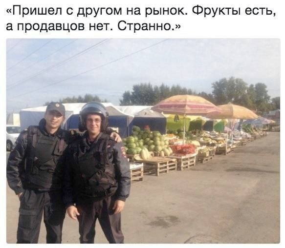 Пришел с другом на рынок. Фрукты есть, а продавцов нет. Странно.