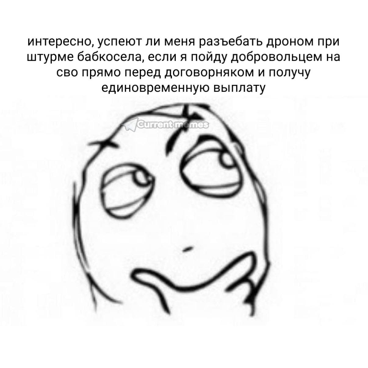 Интересно, успеют ли меня разъебать дроном при штурме бабкосела, если я пойду добровольцем на сво прямо перед договорняком и получу единовременную выплату. Current memes.
