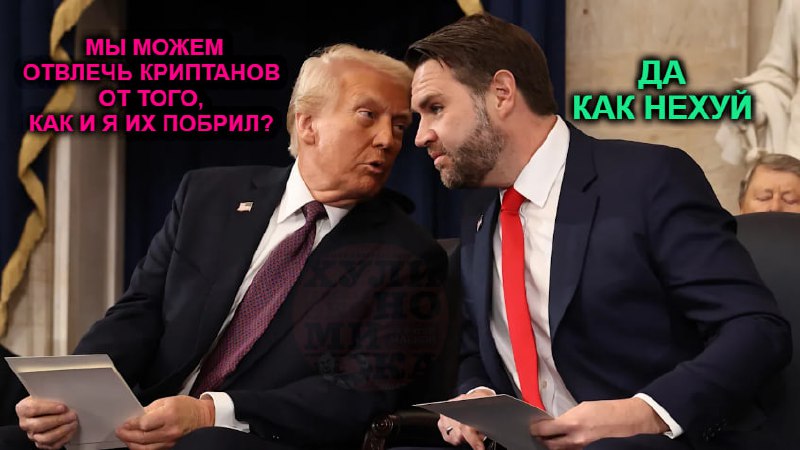 На изображении Дональд Трамп в тёмном костюме и сине-красном галстуке наклоняется к другому мужчине в тёмном костюме с красным галстуком, что-то шепча ему на ухо. Оба сидят на креслах и держат в руках какие-то бумаги. Лица мужчин сосредоточены, они явно о чём-то беседуют. Предположительно, Трамп спрашивает: "Мы можем отвлечь криптанов от того, как и я их побрил?" На что второй мужчина отвечает: "Да как нехуй".