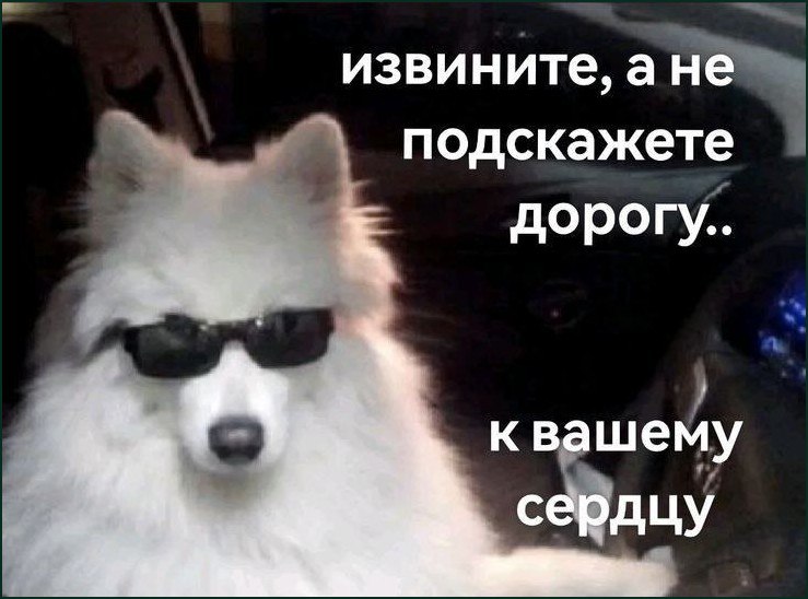 На изображении представлен белый пушистый пес в солнцезащитных очках, который сидит в автомобиле. Создается впечатление, что он смотрит прямо на зрителя. Справа от собаки расположен текст на русском языке, который является классической фразой для знакомства или комплимента, но звучит еще более забавно в устах животного. Текст гласит: "Извините, а не подскажете дорогу к вашему сердцу?", что является игривым способом начать разговор или выразить симпатию.