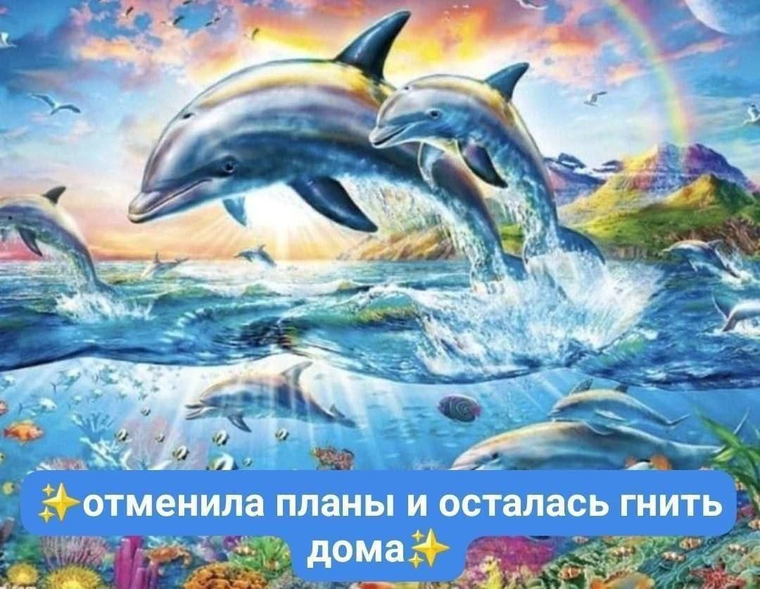 На изображении представлен коллаж с ярко-синим океаном, в котором плавают дельфины, выпрыгивающие из воды. Над водой видны горы, небо с радугой и птицы. Под водой, на дне, можно заметить кораллы и множество рыб. Поверх изображения, на синей полосе, написан текст: «отменила планы и осталась гнить дома», обрамленный блестящими желтыми звездочками. Этот мем используется для выражения ироничного чувства удовлетворения от отмены планов и проведения времени дома, вместо активного отдыха.