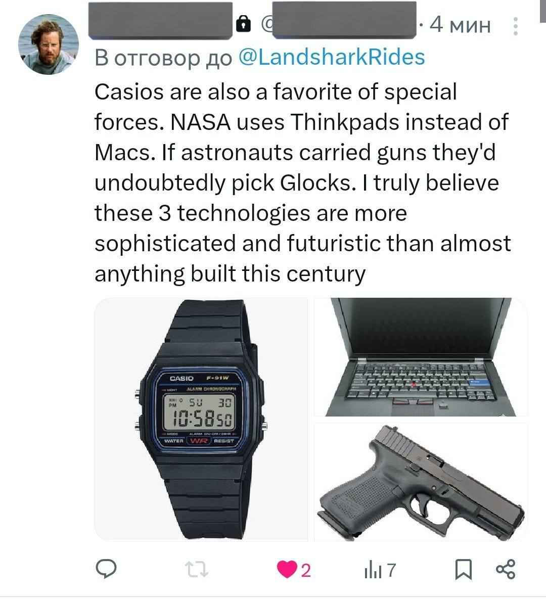 На изображении представлен пост из Твиттера, в котором пользователь восхваляет технологии, которые, по его мнению, более совершенны и футуристичны, чем почти все, что было создано в этом веке. В посте упоминаются часы Casio F-91W, которые, по его словам, являются любимыми среди спецназа. Далее говорится, что НАСА использует ноутбуки ThinkPad вместо Mac'ов, и что если бы астронавты носили оружие, они бы несомненно выбрали Glock. Снизу прикреплены фотографии упомянутых предметов: наручные часы Casio F-91W, ноутбук ThinkPad и пистолет Glock. Полный текст мема гласит: «Casios are also a favorite of special forces. NASA uses Thinkpads instead of Macs. If astronauts carried guns they'd undoubtedly pick Glocks. I truly believe these 3 technologies are more sophisticated and futuristic than almost anything built this century». (Casio также любимы спецназом. НАСА использует Thinkpad вместо Mac. Если бы астронавты носили оружие, они бы, несомненно, выбрали Glock. Я искренне верю, что эти 3 технологии более совершенны и футуристичны, чем почти все, что было создано в этом столетии).