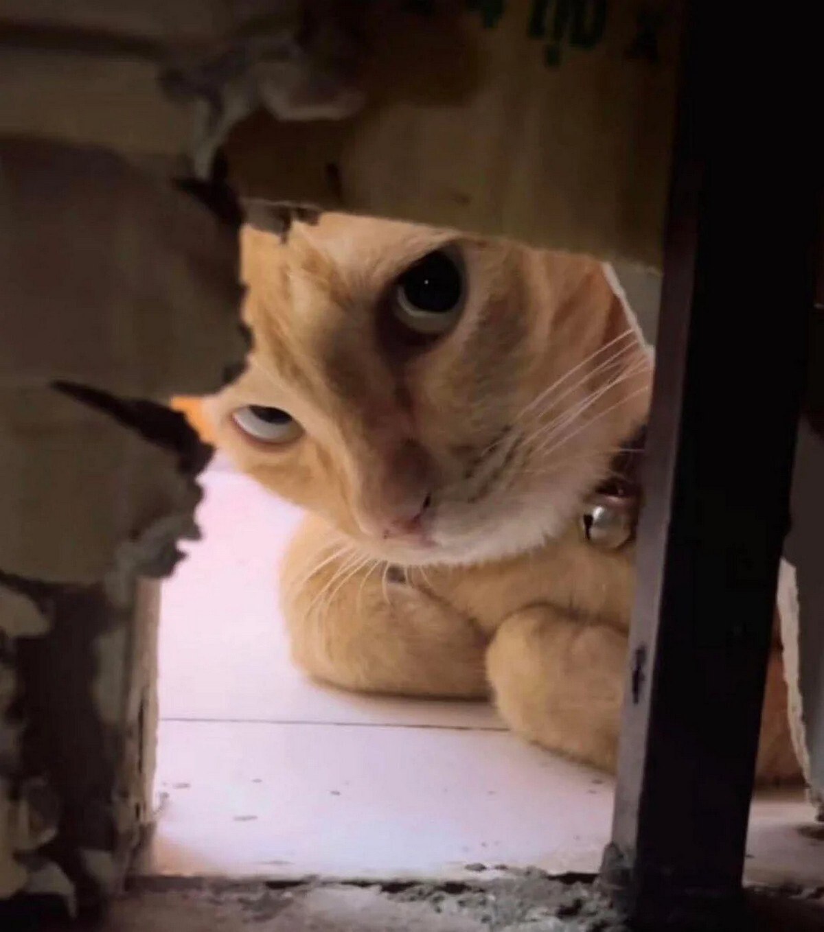 На изображении показан крупный план рыжего кота с колокольчиком на шее, который выглядывает из-за преграды, возможно, стены или мебели, создавая эффект подглядывания. Его глаза смотрят в разные стороны, один вверх, другой прямо, что придает мордочке немного забавное или озадаченное выражение. Фон размыт, но видно, что кот сидит на светлом полу. Мордочка кота выражает любопытство и немного хитрости, будто он что-то замышляет или просто наблюдает за происходящим из своего укрытия. Котик выглядит очень мило и загадочно, что делает это изображение популярным в мемах, где нужно показать чье-то наблюдение или скрытность.