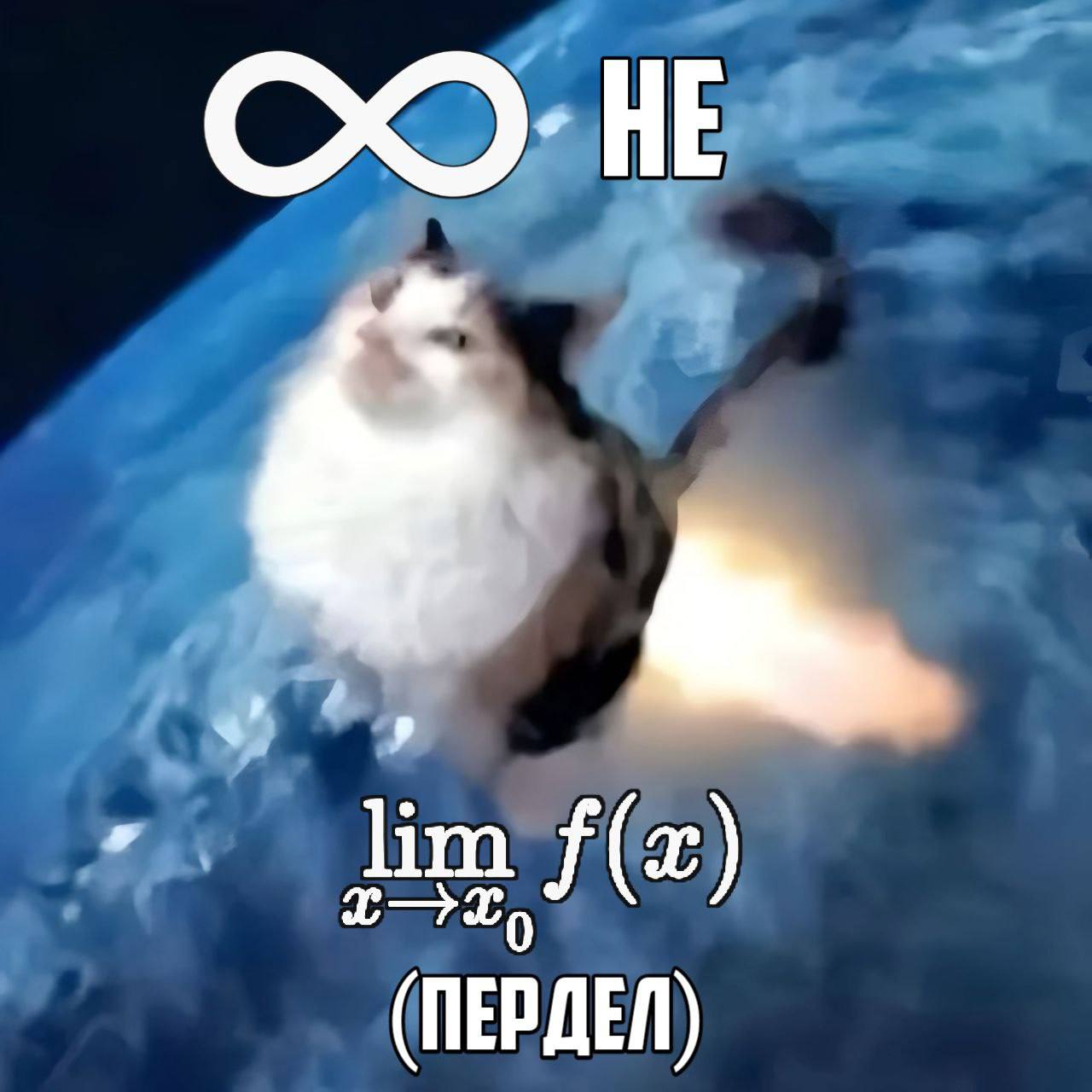 На изображении показан летящий в космосе кот, который очень похож на ракету, у него даже есть хвост пламени сзади, как будто он вот-вот взлетит с планеты Земля. Кот, в свою очередь, имеет трехцветный окрас: рыжий, белый и черный, и его морда кажется недовольной. На фоне видна планета Земля и открытый космос, в котором и летит кот. В верхней части изображения крупными буквами написано ", НЕ", а под котом находится математическая формула предела с подписью "(ПЕРДЕЛ)".