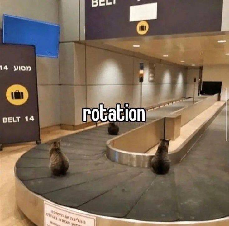 На изображении показан багажный конвейер в аэропорту, по которому движутся два кота. Один кот сидит на самом конвейере, смотря вдаль, а другой кот находится чуть дальше, за разделительной перегородкой. Надпись на изображении гласит "rotation", что означает "вращение" или "поворот". На заднем плане видны указатели на иврите и английском языке с надписью "BELT 14", что указывает на номер багажной ленты. Общая атмосфера сюрреалистична и забавна, так как животные находятся в необычном для них месте, используя конвейер как аттракцион.