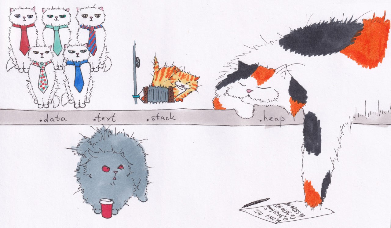 На изображении представлено несколько котов, каждый из которых символизирует разные области памяти в программировании. В верхней части картинки, на условной полке, находятся белые коты в галстуках, которые, судя по надписям под ними, относятся к секциям .data и .text. Рядом с ними, в области .stack, сидит рыжий кот, играющий на аккордеоне или гармошке. Дальше, в области .heap, лежит большой трехцветный кот, который, кажется, спит или отдыхает. Под полкой, внизу слева, изображен серый пушистый кот с красной кружкой, символизирующий другую область памяти или состояние. Этот мем, вероятно, предназначен для программистов и людей, знакомых с архитектурой памяти.