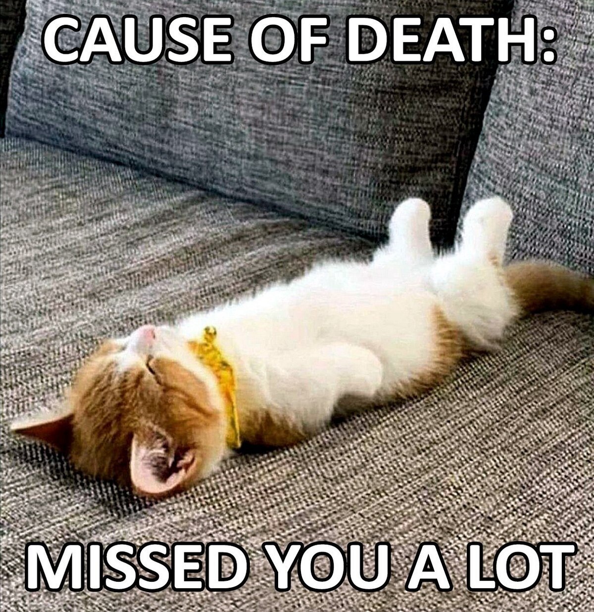 На изображении представлен милый рыже-белый котенок, лежащий на спине на сером диване или кресле. Его лапки забавно вытянуты вверх, а голова повернута набок, создавая впечатление глубокого и расслабленного сна. На шее у котенка можно заметить яркий желтый ошейник. Над и под спящим животным расположен текст, который дополняет юмористический смысл изображения. Этот мем обыгрывает забавное преувеличение, связывая глубокий сон котенка с сильной тоской по кому-то. Можно сказать, что «причина смерти» в этом случае — это «очень сильно скучал» по кому-то, до такой степени, что устал и уснул в забавной позе.