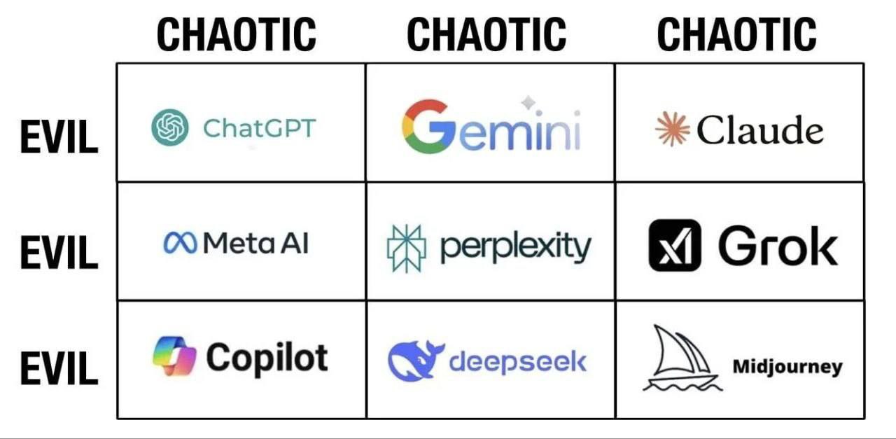 Chaotic. Chaotic. Chaotic. Evil. Evil. Evil. ChatGPT. Gemini. Claude. Meta AI. Perplexity. Grok. Copilot. Deepseek. Midjourney.