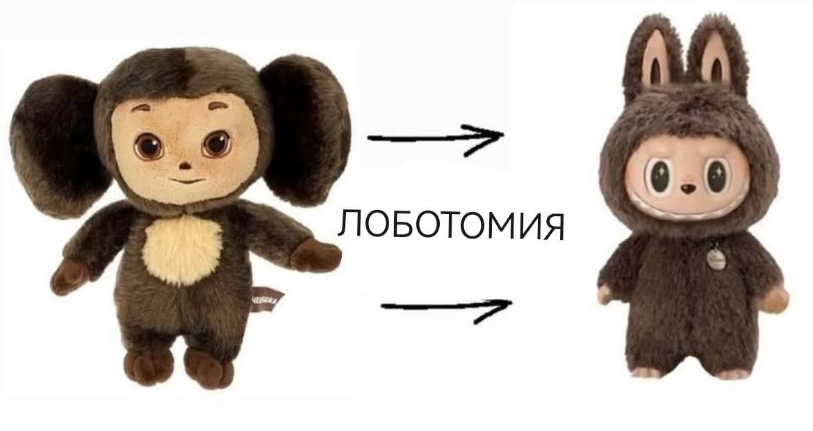 На изображении показаны две версии Чебурашки: классическая плюшевая игрушка слева и её "лоботомированная" версия справа. Классический Чебурашка выглядит милым и дружелюбным, с большими ушами и доброй улыбкой. Справа же изображен Чебурашка в капюшоне с заячьими ушами, его лицо выглядит странно, глаза широко раскрыты и лишены зрачков, а улыбка кажется жуткой, что иронично названо "лоботомией". Между двумя изображениями Чебурашки есть надпись "Лоботомия" со стрелками, указывающими от классической версии к измененной, подразумевая, что вторая версия "потеряла душу" или свой первоначальный шарм. Русский перевод надписи "Лоботомия" используется как метафора радикального изменения, которое привело к утрате характерных черт.