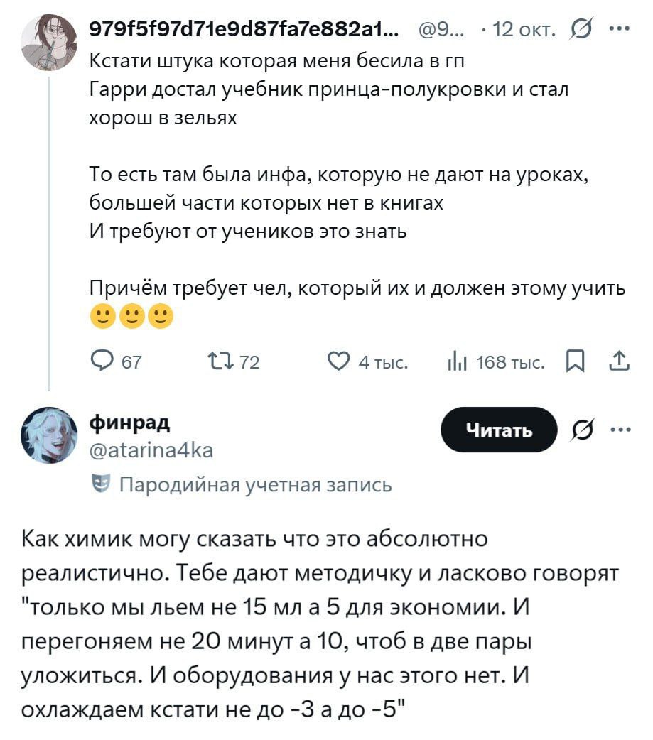 Изображение представляет собой скриншот из твиттера, где пользователь делится мыслями о нелогичности в мире Гарри Поттера, касающейся учебника Принца-полукровки и зельеварения. Он указывает, что информация, которая не преподавалась на уроках и не была в книгах, требовалась от учеников. Второй пользователь, представившийся химиком, подтверждает реалистичность такой ситуации, описывая похожие проблемы в реальной академической среде: экономия на реактивах, сокращение времени на эксперименты, отсутствие необходимого оборудования и несоблюдение температурных режимов.