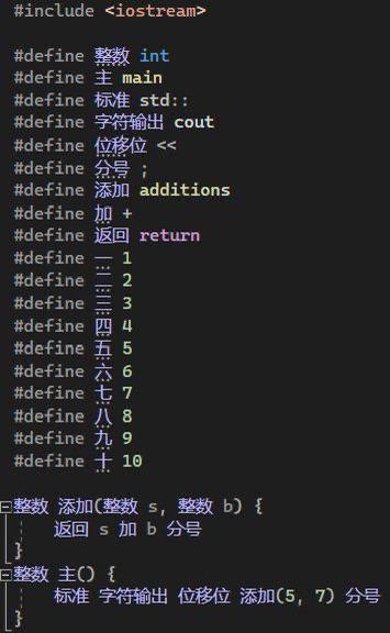 #include <iostream>#define 整数 int#define 主 main#define 标准 std::#define 字符输出 cout#define 位移位 <<#define 分号 ;#define 添加 additions#define 加 +#define 返回 return#define 一 1#define 二 2#define 三 3#define 四 4#define 五 5#define 六 6#define 七 7#define 八 8#define 九 9#define 十 10整数 添加(整数 s, 整数 b) {返回 s 加 b 分号}整数 主() {标准 字符输出 位移位 添加(5, 7) 分号}