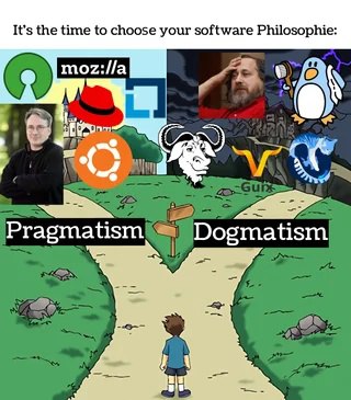 На изображении представлен мем с развилкой дороги, символизирующей выбор между двумя философиями программного обеспечения: "Прагматизм" (Pragmatism) и "Догматизм" (Dogmatism). Маленький мальчик стоит у развилки, глядя на указатели. Над каждой из дорог расположены изображения известных личностей и логотипов, ассоциирующихся с соответствующей философией. Над дорогой "Прагматизм" изображены Линус Торвальдс, логотипы Mozilla, Ubuntu и Red Hat. Над дорогой "Догматизм" изображены Ричард Столлман, GNU, Tux (пингвин Linux) и FreeBSD. Заголовок мема гласит: "Пришло время выбрать свою философию программного обеспечения".