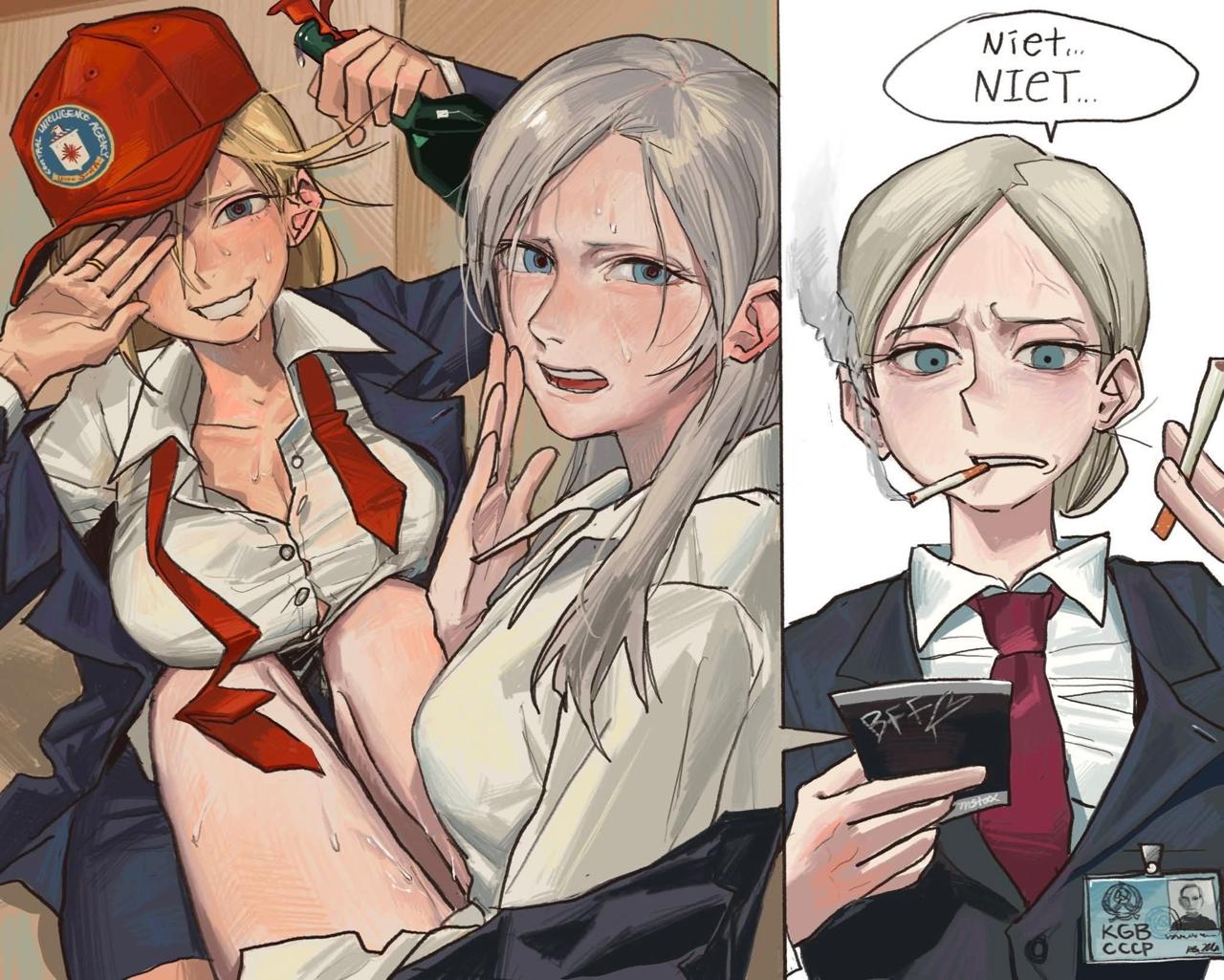 На этом меме изображены две девушки, одна из которых, блондинка в красной кепке с надписью «Intelligeace agency» и растегнутой рубашке, пьет алкоголь из бутылки и весело улыбается, прикрывая глаза рукой. Другая девушка с седыми волосами сидит рядом, ее глаза выражают легкое беспокойство или стыд, а на щеках румянец. На ней тоже костюм, белая рубашка и красный галстук. На правой стороне мема та же седовласая девушка курит сигарету и держит в руке пачку сигарет, а в облачке над головой написано «Niet… Niet…». Она одета в деловой костюм с красным галстуком, а на лацкане пиджака прикреплен бейджик с надписью «KGB СССР» и маленькой фотографией.