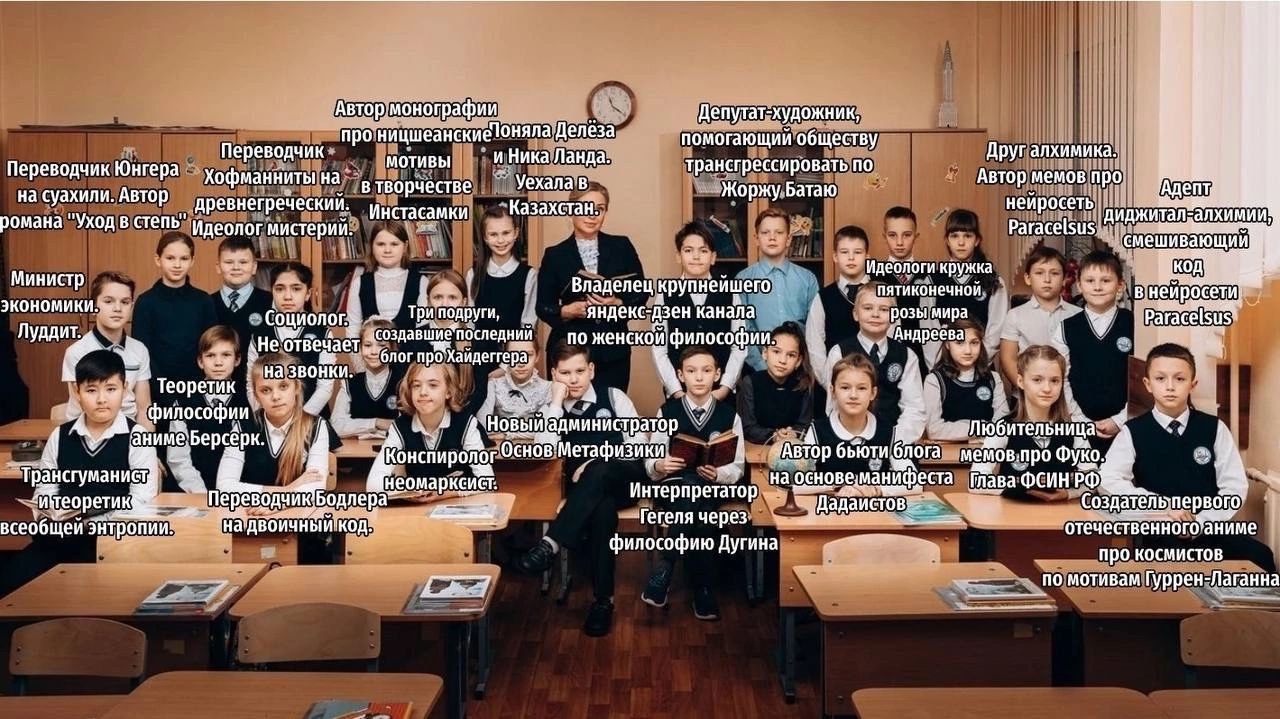 На изображении показан класс учеников в школьной форме, которые сидят за партами и стоят у доски. Над каждым учеником есть подпись с его «профессией» или «специализацией», которая выглядит очень необычно и даже абсурдно для такого возраста. Например, "Министр экономики. Луддит.", "Социолог. Не отвечает на звонки.", "Автор монографии про ницшеанские мотивы и Ника Ланда.", "Создатель первого отечественного аниме про космистов по мотивам Гуррен-Лаганна" и другие. Преподавательница, которая стоит в центре, тоже имеет подпись: "Уехала в Казахстан". Мем "Класс элиты" высмеивает претенциозность, слишком глубокомысленные рассуждения или просто желание выделиться необычными увлечениями.