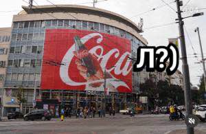 На изображении представлено многоэтажное здание с огромным рекламным баннером Coca-Cola на его фасаде. Баннер выполнен в фирменных красных и белых цветах, на нем изображена рука, держащая бутылку напитка, и крупный логотип "Coca-Cola". Перед зданием находится оживленный городской перекресток с припаркованными машинами и прохожими. Справа на фотографии на черном фоне добавлен текст "Л?)".