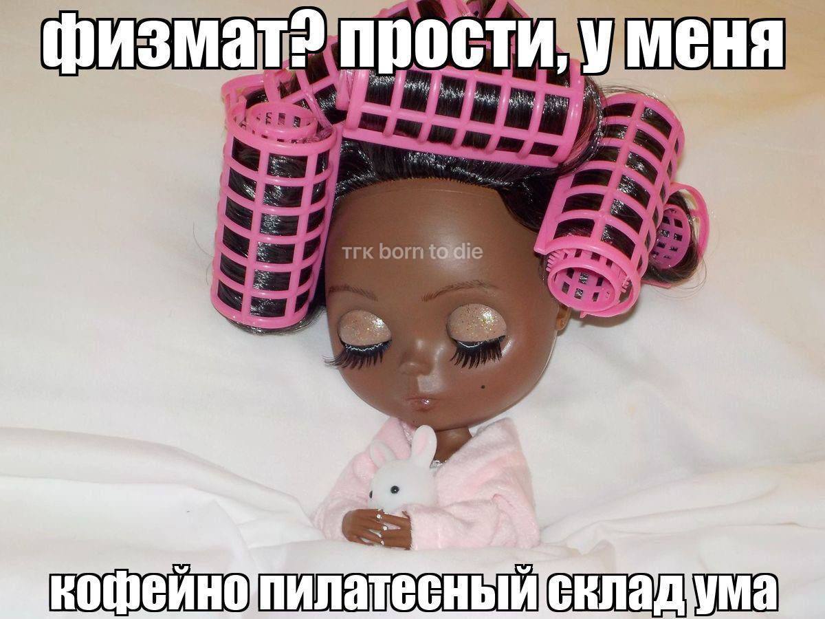 На изображении показана кукла с тёмной кожей, уложенными в розовые бигуди волосами и блестящими веками. Она одета в нежно-розовую кофточку и держит в руках белого кролика. Кукла смотрит вниз, а фон изображения простой, белый. Надпись на меме, "Физмат? Прости, у меня кофейно-пилатесный склад ума" означает, что человек предпочитает более расслабленный и не обременённый сложными задачами образ жизни, чем академические занятия, такие как физика и математика.