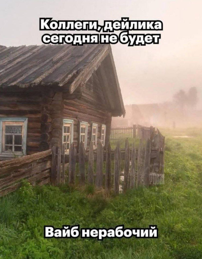 На картинке изображен туманный сельский пейзаж с деревянным домом и забором. Утро выглядит туманным и прохладным, создавая атмосферу спокойствия и умиротворения. На фоне этого умиротворяющего вида расположены надписи, которые создают забавный контраст: "Коллеги, дейлика сегодня не будет" и "Вайб нерабочий". Это создает юмористический эффект, так как атмосфера настолько расслабляющая, что намекает на нежелание заниматься работой. Перевод фразы "Вайб нерабочий" означает, что "настроение нерабочее" или "атмосфера не располагает к работе".