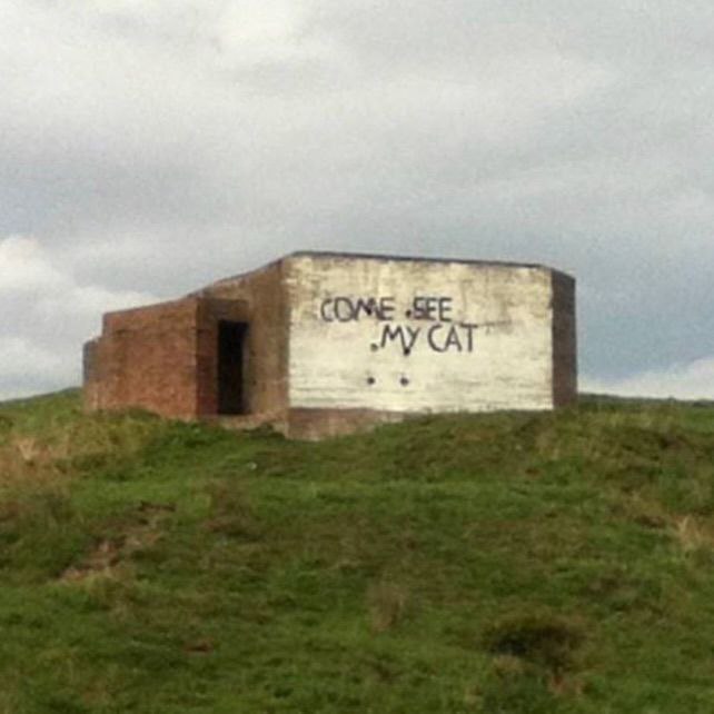 На изображении показан бетонный бункер на вершине травянистого холма под серым пасмурным небом. Стены бункера сделаны из грубого бетона, а на одной из них видны следы выветривания и граффити. На белой стене черной краской написано: "COME SEE MY CAT" (Приходи посмотреть мою кошку). Под текстом нарисованы две небольшие черные точки, которые могут символизировать глаза. Бункер находится в центре кадра, окруженный зеленым холмом, который простирается на переднем плане и вокруг постройки. Вход в бункер темный и открытый, что придает ему немного таинственный и жутковатый вид. Общий фон — это светлое, но облачное небо, которое создает контраст с темной растительностью и зданием.