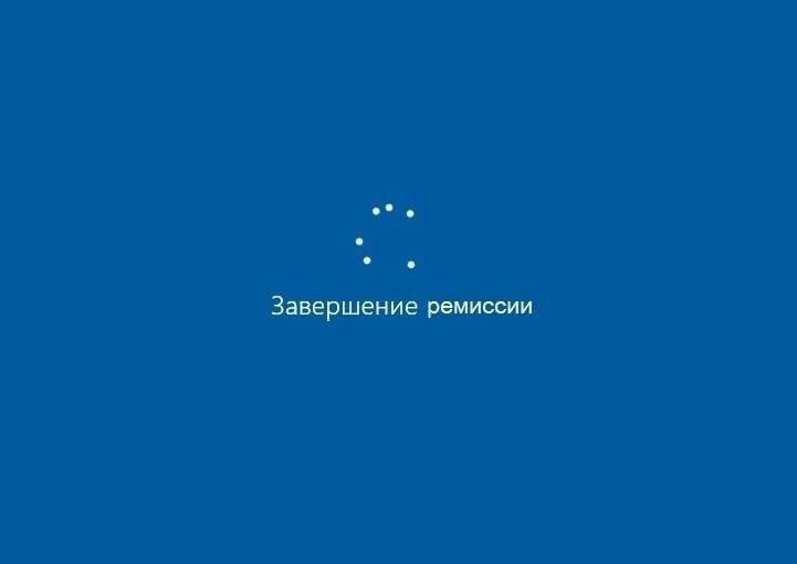 На изображении представлен синий экран, напоминающий экран загрузки или обновления операционной системы Windows. В центре экрана расположены белые движущиеся точки, образующие круг, что обычно символизирует процесс ожидания или выполнения операции. Под этими точками находится надпись белым цветом: «Завершение ремиссии». Эта фраза является переделанной версией стандартного сообщения «Завершение работы» или «Завершение обновления», но вместо технического термина используется медицинский — «ремиссия», что придает изображению юмористический или иронический оттенок, отсылающий к окончанию периода улучшения состояния или затишья перед обострением.