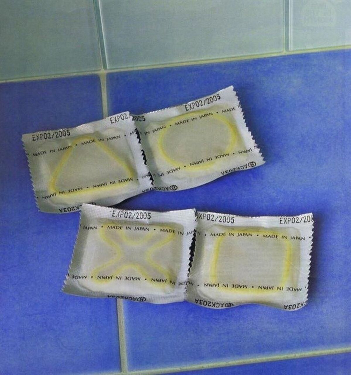 На изображении показаны четыре презерватива в индивидуальных упаковках, лежащие на синей кафельной плитке, возможно, в ванной комнате. Упаковки белые с прозрачной частью, через которую видны желтоватые презервативы внутри. На каждой упаковке четко видна надпись "EXPO2/2005", что указывает на срок годности — февраль 2005 года. Также на упаковках присутствует надпись "MADE IN JAPAN" (Сделано в Японии). Этот мем часто используется для иллюстрации ситуаций, когда что-то просрочено или сильно устарело, но все еще пытаются использовать. Он может символизировать затягивание с важными решениями или попытку применить давно неактуальные вещи в современных условиях, вызывая юмористический или ироничный эффект.