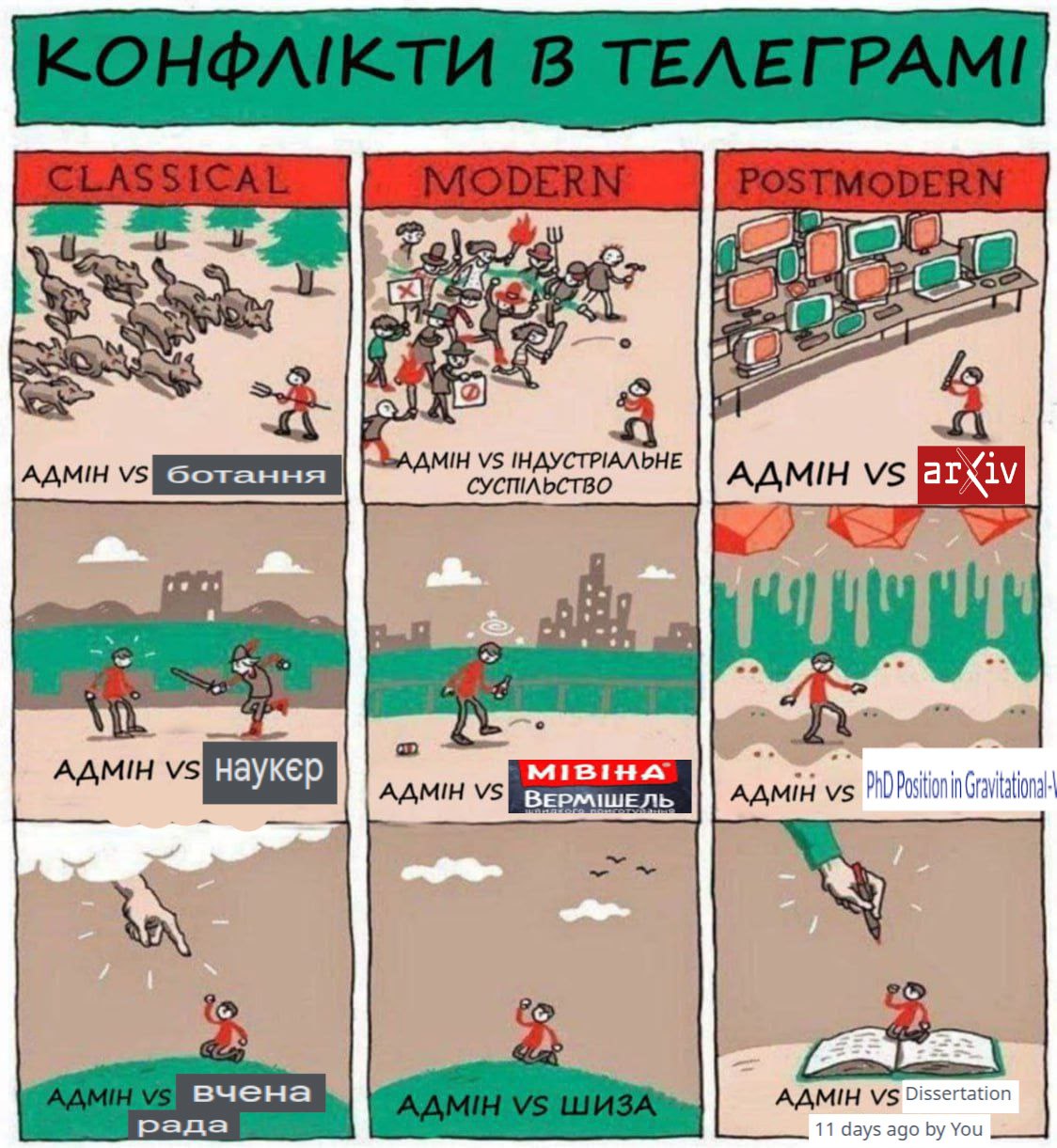 На изображении показан мем под названием "Конфликты в телеграме", который разделен на три колонки: "Classical", "Modern" и "Postmodern". В каждой колонке представлены три разных сценария конфликтов, в которых админ (администратор) противостоит различным сущностям или явлениям. В классическом разделе админ сражается с ботами, "наукером" (возможно, ученым или хакером) и "ученой радой" (ученым советом), представленной рукой с небес. В современном разделе админ противостоит индустриальному обществу, лапше "Мівіна" и "шизе" (сумасшествию или безумию). В постмодернистском разделе админ борется с "arXiv", надписью "PhD Position in Gravitational-V" и "Dissertation 11 days ago by You" (диссертацией, написанной 11 дней назад пользователем). Этот мем иллюстрирует эволюцию конфликтов, с которыми сталкиваются администраторы, от простых и понятных угроз до более абстрактных и интеллектуальных вызовов, таких как академические публикации и диссертации. Разделение на "классический", "современный" и "постмодернистский" подходы добавляет юмористический и философский подтекст.