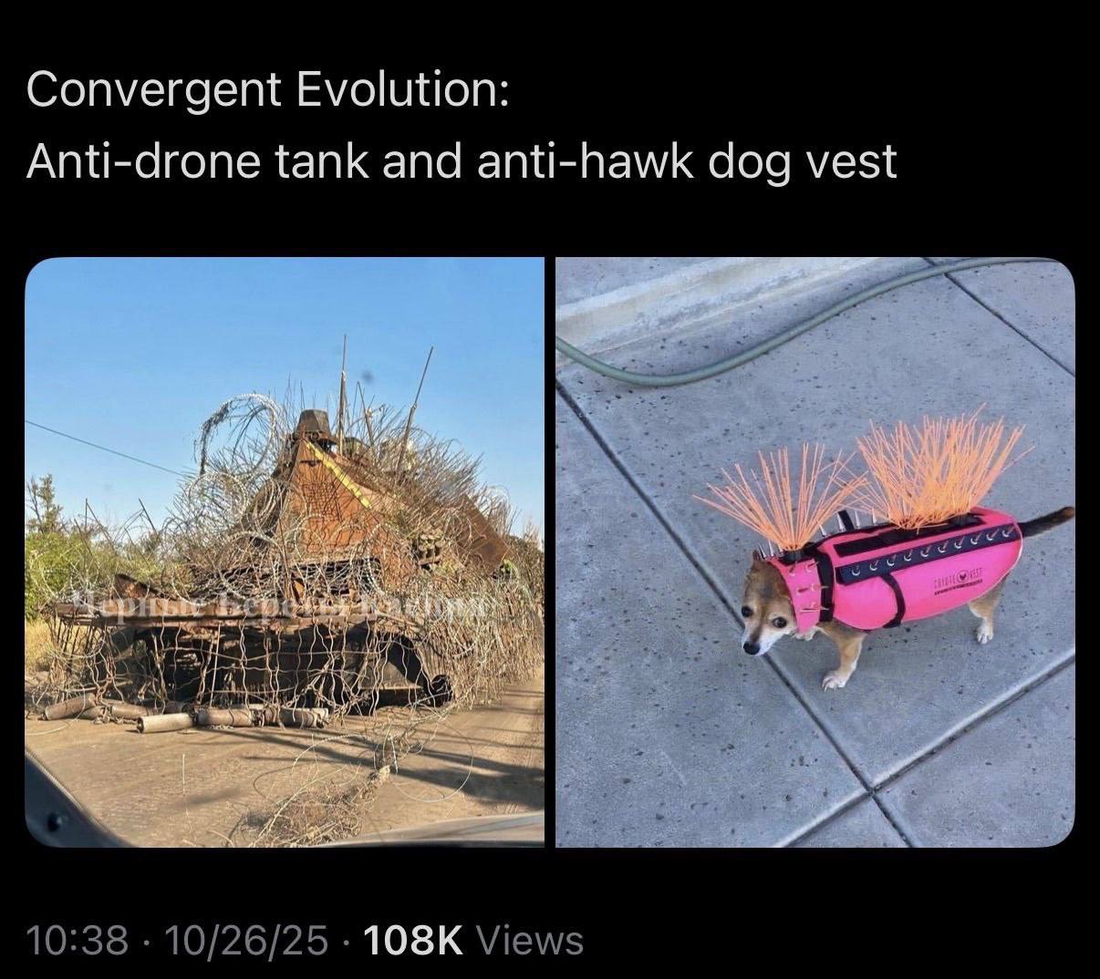 Convergent Evolution: Anti-drone tank and anti-hawk dog vest.