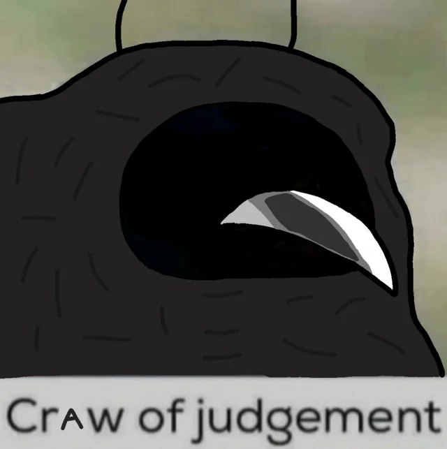 На изображении показано абстрактное черное существо, напоминающее птицу или ворона, с большой головой и одной изогнутой белой деталью, похожей на клюв или острый коготь, который выходит из черной полости. Фон размытый, с оттенками зеленого и коричневого. Под изображением находится надпись на английском языке: "Craw of judgement", что переводится как "Коготь осуждения". Этот мем символизирует критическую или осуждающую реакцию на что-либо, выраженную в форме угрожающего или оценивающего взгляда/действия.