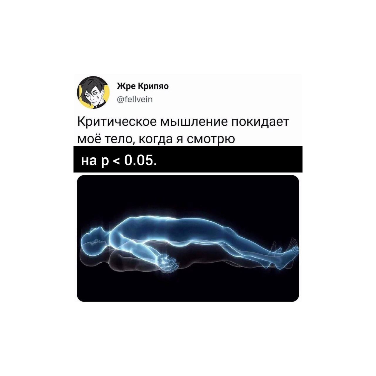 Мем изображает твит пользователя «Жре Крипяо» с ником @fellvein. В твите написано: «Критическое мышление покидает моё тело, когда я смотрю на p < 0.05». Ниже расположена иллюстрация, демонстрирующая полупрозрачное синее тело человека, словно это его душа или астральная проекция, лежащая над более тёмным, менее чётким контуром физического тела. Это визуально передаёт идею отделения или выхода чего-то из тела. Мем юмористически обыгрывает ситуацию, когда, возможно, при столкновении с научными данными или статистикой (символизируемой p < 0.05), критическое мышление отключается или становится излишним.