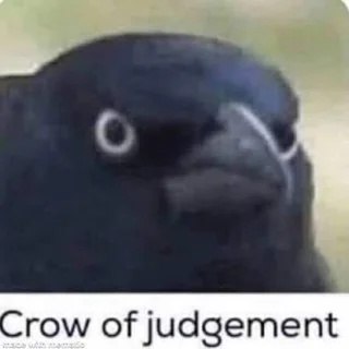 На изображении крупным планом показана голова вороны или грача. У птицы тёмное оперение, один глаз полностью открыт и выглядит слегка выпученным, с чётко очерченным белым кольцом вокруг зрачка, что придаёт ей удивлённый или оценивающий вид. Клюв направлен вперёд, и его верхняя часть частично скрыта. Под изображением птицы расположен текст «Crow of judgement», что переводится как «Ворона осуждения».