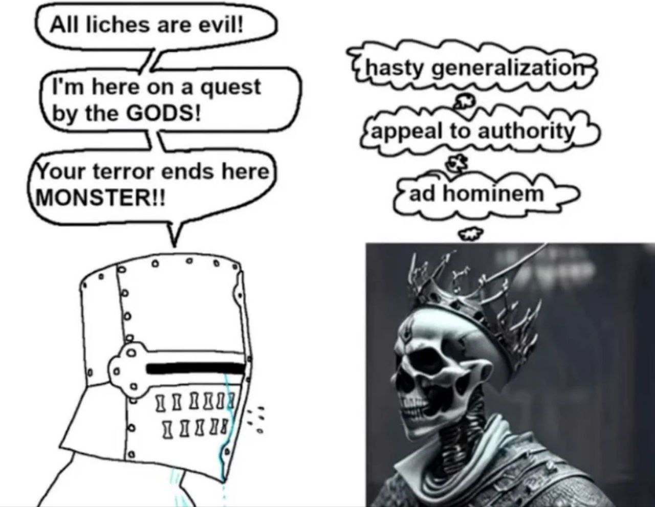 Мем изображает разговор между нарисованным рыцарем в шлеме, из глаз которого текут слезы, и изображением лича-скелета в короне. Рыцарь произносит три фразы: "All liches are evil!" (Все личи злые!), "I'm here on a quest by the GODS!" (Я здесь по поручению БОГОВ!), "Your terror ends here MONSTER!!" (Твой террор закончится здесь, МОНСТР!!). Лич же отвечает ему мыслями: "hasty generalization" (поспешное обобщение), "appeal to authority" (апелляция к авторитету), "ad hominem" (переход на личности). Мем высмеивает использование логических ошибок в спорах, когда одна сторона прибегает к эмоциональным заявлениям и неаргументированным утверждениям, а другая сторона молчаливо, но аргументированно указывает на логические изъяны в доводах оппонента.