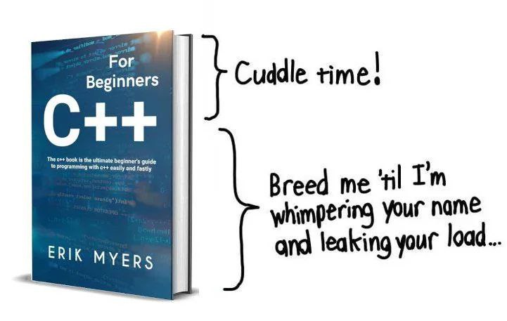 На изображении показана книга под названием "C++ For Beginners" (C++ для начинающих) с именем автора Эрика Майерса. Справа от книги находится рукописный текст с двумя фигурными скобками. Верхняя скобка указывает на верхнюю часть обложки книги и рядом с ней написано "Cuddle time!" (Время обнимашек!). Нижняя, более длинная скобка охватывает оставшуюся часть книги и сопровождается текстом "Breed me 'til I'm whimpering your name and leaking your load..." (Размножай меня, пока я не буду скулить твое имя и не истеку твоим грузом...). Этот мем играет на контрасте между невинным заголовком книги для начинающих программистов и крайне откровенными, сексуальными фразами, которые как бы относятся к содержимому или реакции на изучение такого сложного языка программирования.