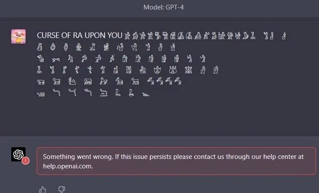 На изображении показан скриншот чата с языковой моделью GPT-4. В начале чата пользователь ввел фразу "CURSE OF RA UPON YOU" (Будь ты проклят Ра) и затем множество древнеегипетских иероглифов, что выглядит как попытка наложить магическое проклятие. Однако в ответ на это действие система выдает сообщение об ошибке: "Something went wrong. If this issue persists please contact us through our help center at help.openai.com." (Что-то пошло не так. Если проблема не исчезнет, свяжитесь с нами через наш справочный центр по адресу help.openai.com.). Это создает комический эффект, будто искусственный интеллект не понял древнее проклятие и просто сломался.