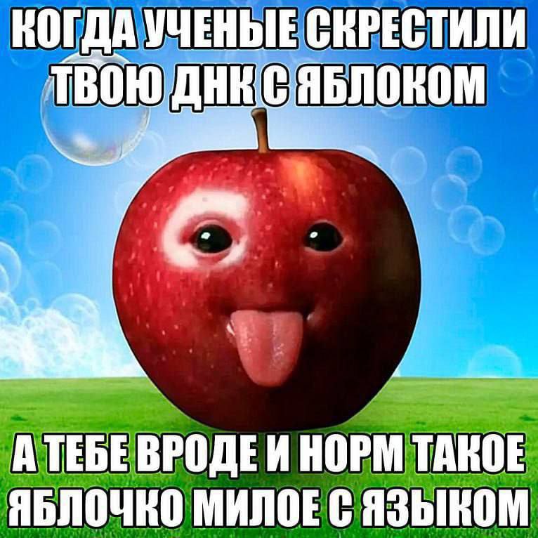 На изображении представлено красное яблоко с необычными чертами лица. У него есть два круглых черных глаза и высунутый розовый язык, что придает ему забавный и игривый вид. Яблоко выглядит очень мило и будто позирует для фотографии. Фон мема состоит из ярко-голубого неба с облаками и зеленого поля. В верхней части картинки есть надпись: «Когда ученые скрестили твою ДНК с яблоком. А тебе вроде и норм такое яблочко милое с языком». Эта надпись объясняет, почему яблоко выглядит так необычно, и добавляет юмора изображению. Получается, что это как бы ДНК скрестили с яблоком, и получилось такое милое яблочко.